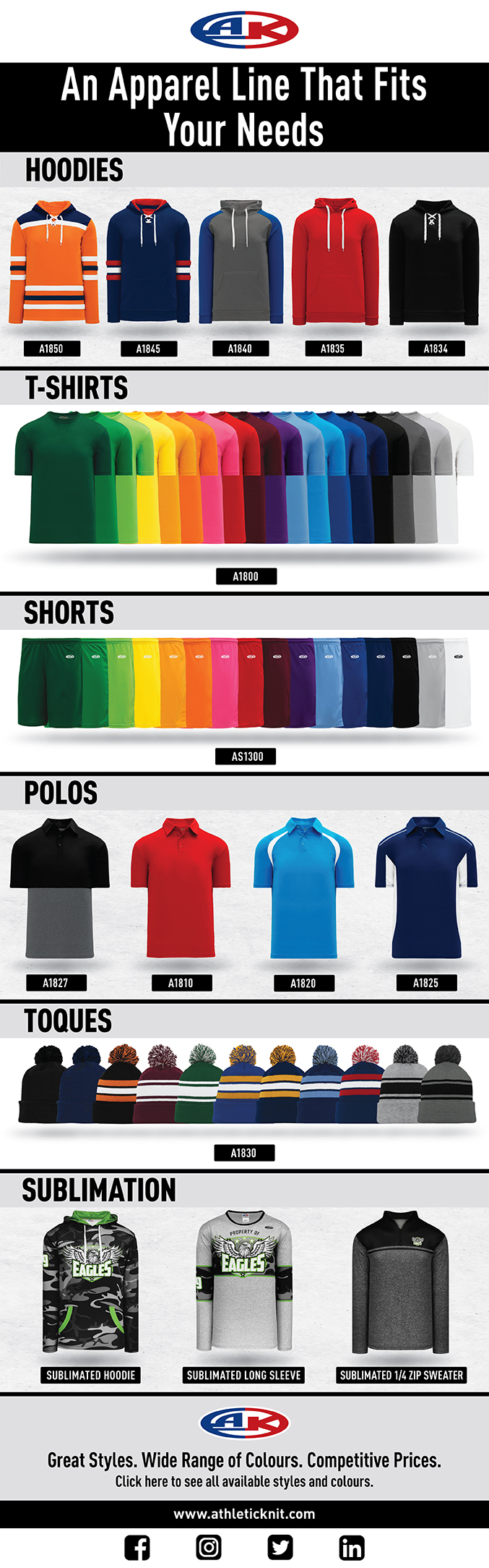 Athletic Knit provides many options to outfit your team. Click here to view apparel and color choices.